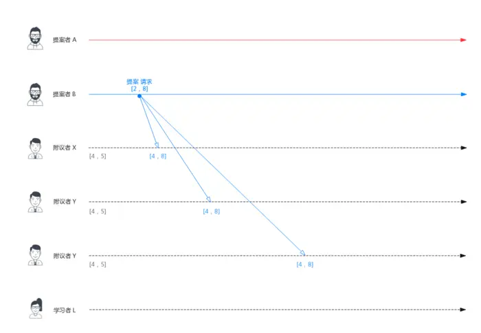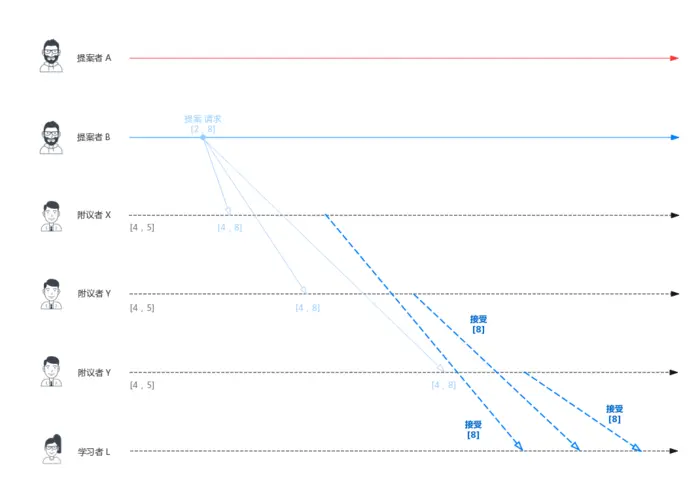 Proposer B 过后也收到了两个提议响应,因此也开始发送接受请求。需要注意的是,接受请求的 v 需要取它收到的最大 v 值,也就是 8。因此它发送[n=4, v=8] 的接受请求。
