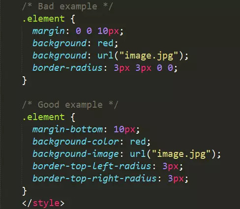 大部分情况下,我们不需要为简写形式的属性声明指定所有值。例如,HTML 的 heading 元素只需要设置上、下边距(margin)的值,因此,在必要的时候,只需覆盖这两个值就可以。过度使用简写形式的属性声明会导致代码混乱,并且会对属性值带来不必要的覆盖从而引起意外的副作用。