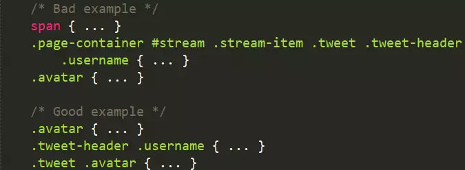 (3)选择器要尽可能短,并且尽量限制组成选择器的元素个数,建议不要超过 3 。