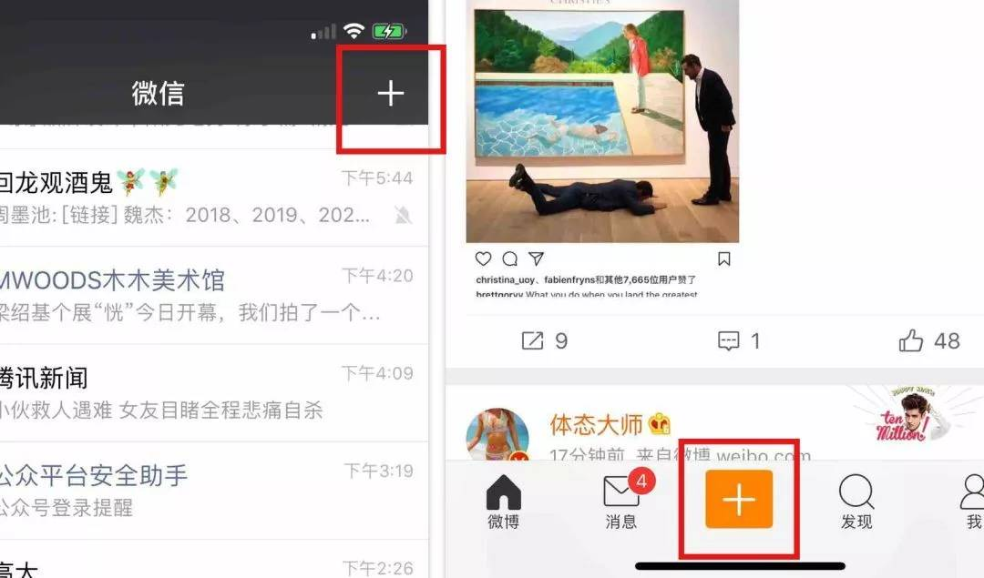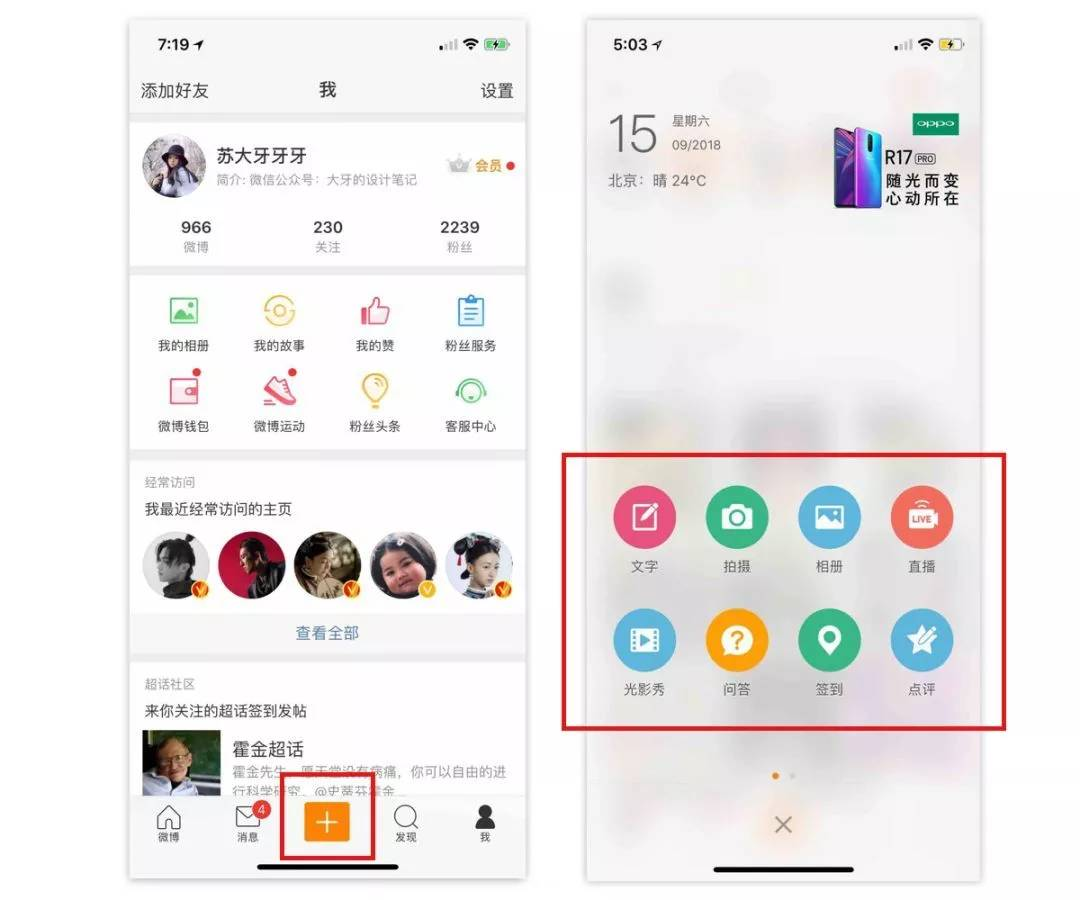 根据“+”的直观表意,大致也能猜到它的运用跟“添加”、“上传”某个东西相关。比如:微博,点击“+”入口后,是选择所要上传的内容类型。(可以晒自己精修X小时后妈都认不出来的自拍、也可以晒逗比的小视频、或者老子就想搞一场直播)。