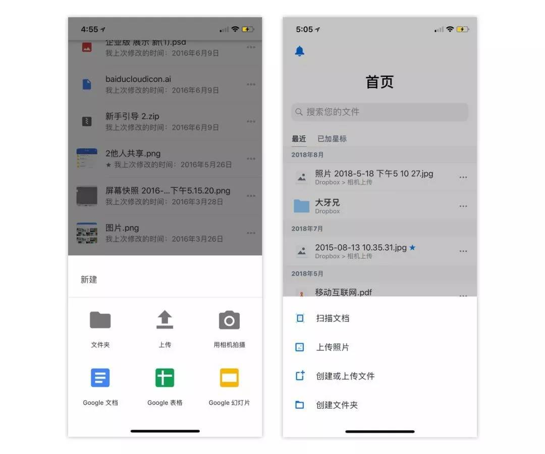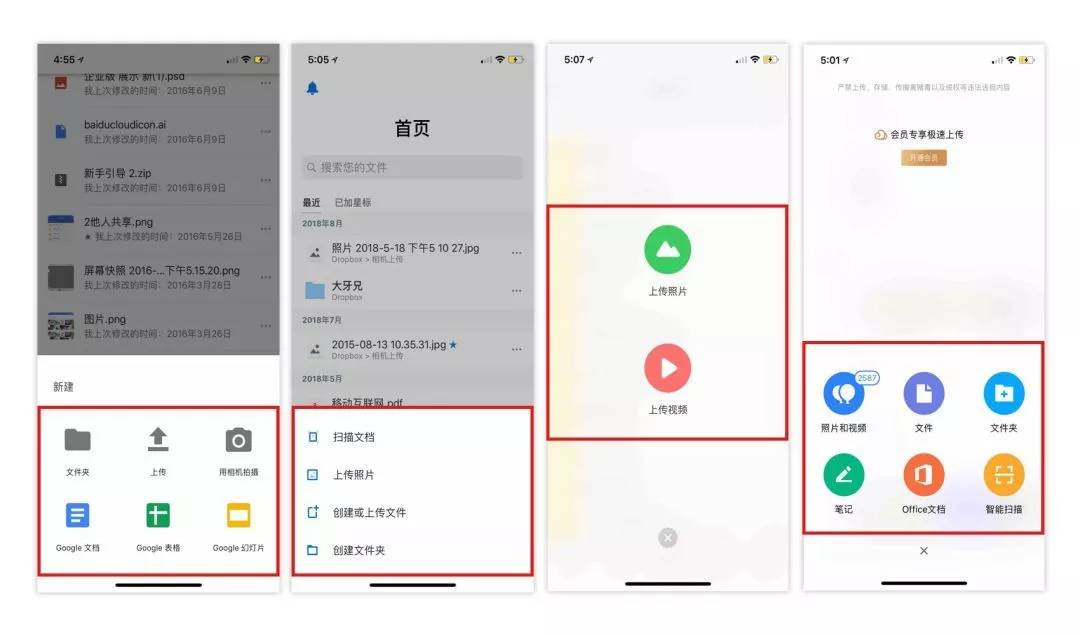 再比如:工具类产品:Google drive,dropbox、百度网盘、微云,点击“+”后,同样是选择上传不同文件的入口。