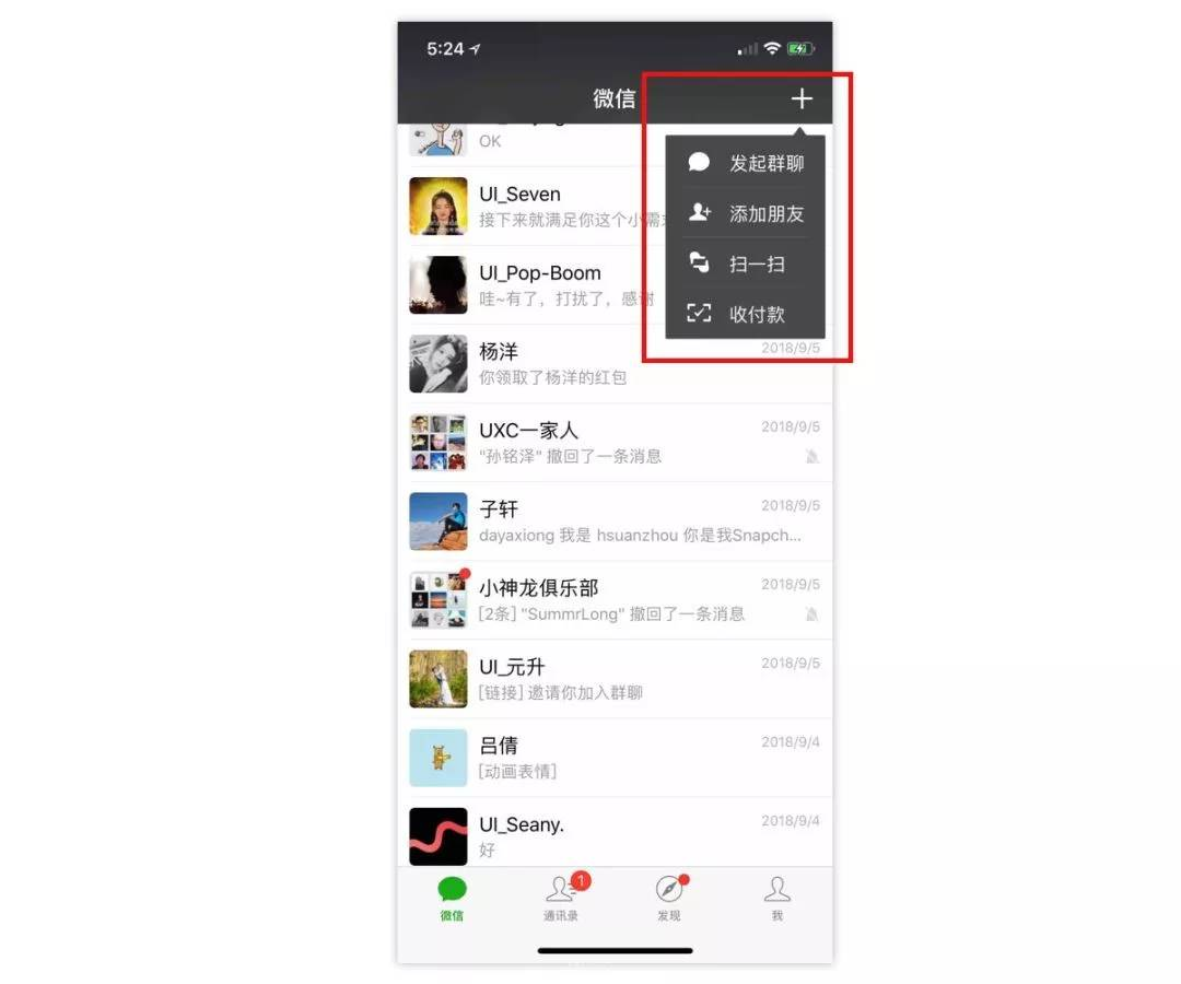 比如:微信里的“+”,包含着:“发起群聊”,“添加朋友”,“扫一扫”,“收付款”,其实都跟“添加”有关。