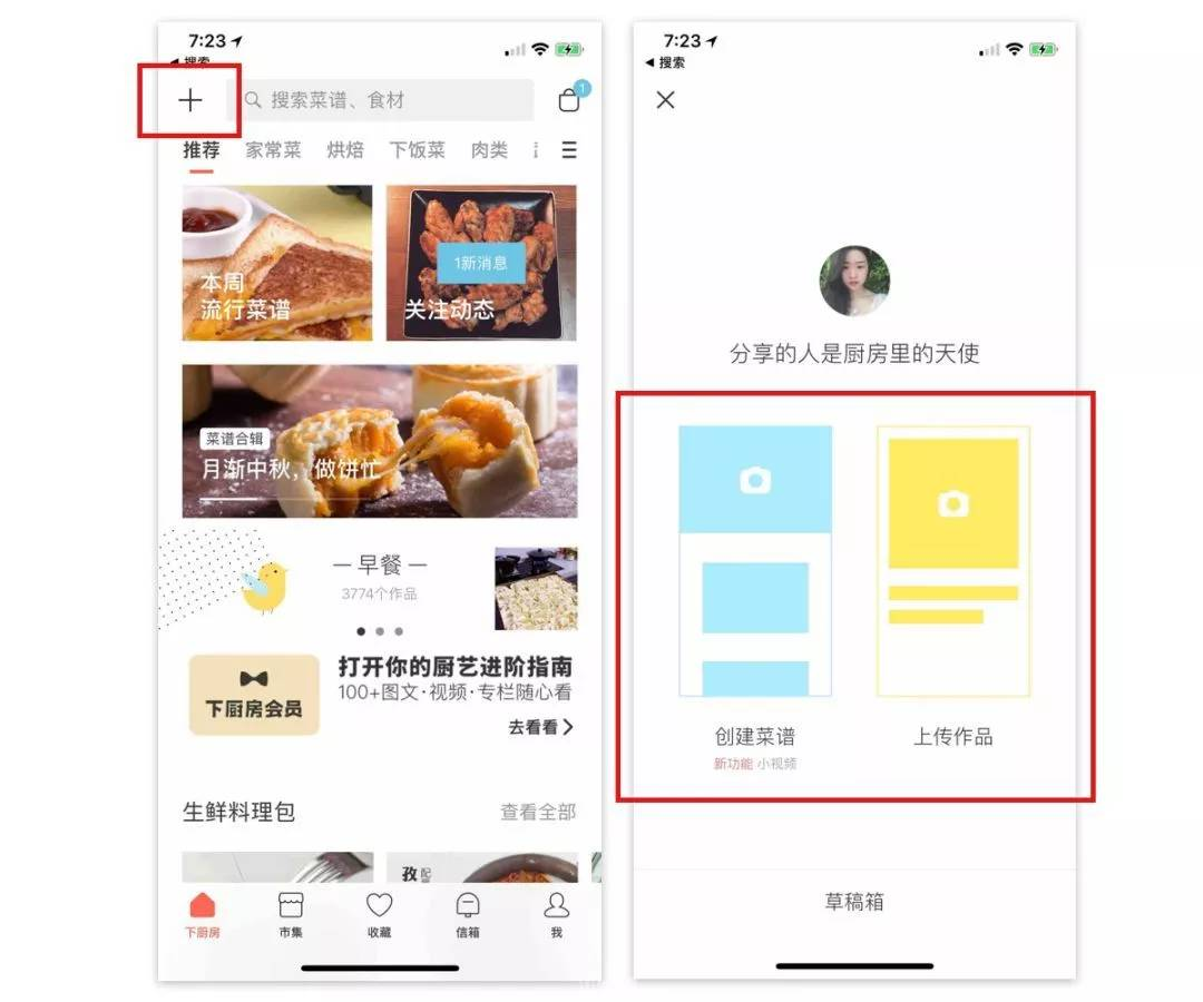 比如:下厨房左上角的“+”,点击后,是选择上传作品,或者创建菜谱的选项。