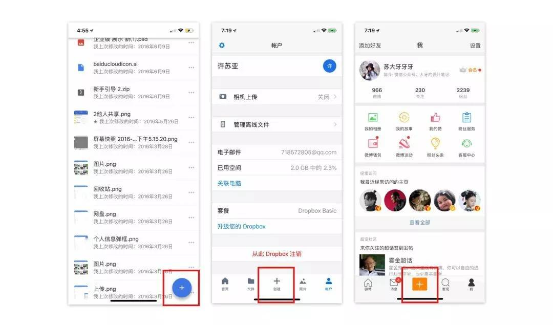 在这个部分,同事们讨论有些争议点,在于:google drive 和 Dropbox或者微博,它们的加号本来就在底部,所以弹窗让用户感觉视线统一。