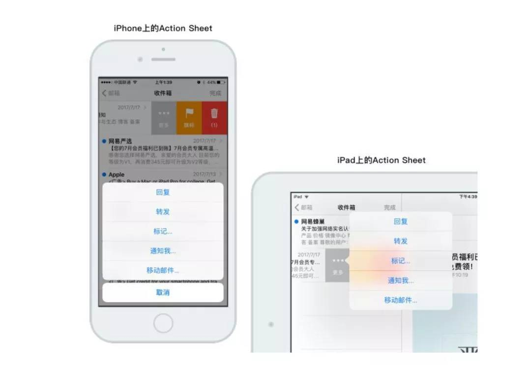 后来看了规范发现,iOS确实意识到在iPad上,如果继续将Action Sheet显示在屏幕底部,如果频繁操作使用会比较累。因此,做了特殊处理。而手机屏幕上以底部为主,同时点击空白区域取消的操作,也是系统用户所熟知的。