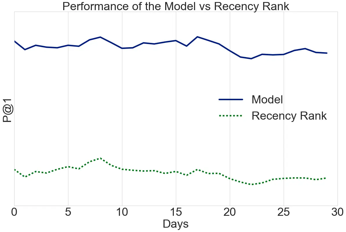 我们对模型进行了离线评估。Baseline是之前的系统,其中的节目只是根据每个节目上次播放的最近时间进行排序。该数据在我们的新模型中也被用作特征。比较模型与新近度排名,我们观察到各种离线指标的显着提升。下图显示了两种方案随时间的精度@ 1。可以看出,性能提升远大于日常变化。该模型在A / B测试中的表现也明显优于基于新近度的排名,并且更好地符合我们对成员行为的期望。