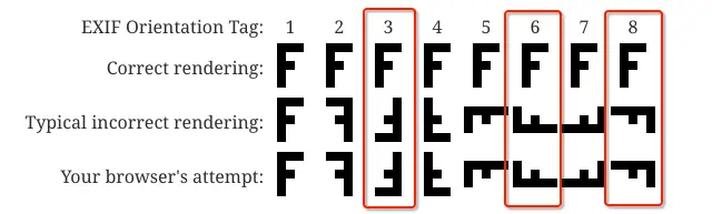 下面是 EXIF 旋转标志位,总共有 8 种,但是通过相机拍摄时只能产生1、3、6、8 四种,分别对应相机正常、顺时针旋转180°、逆时针旋转90°、顺时针旋转90°时所拍摄的照片。