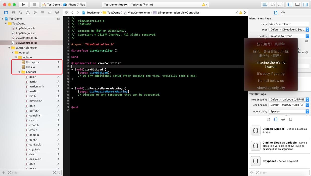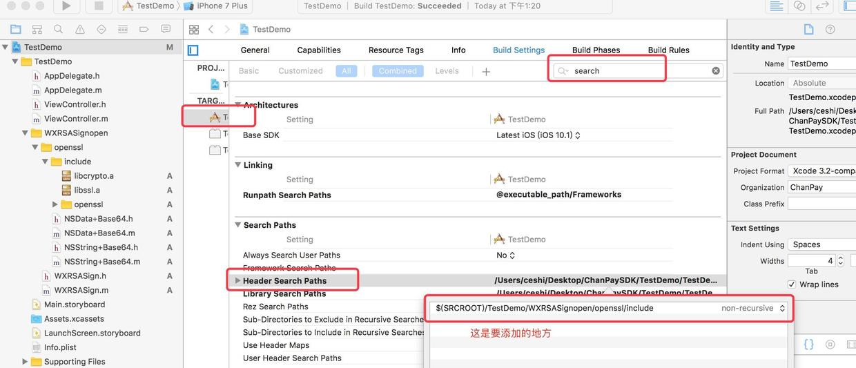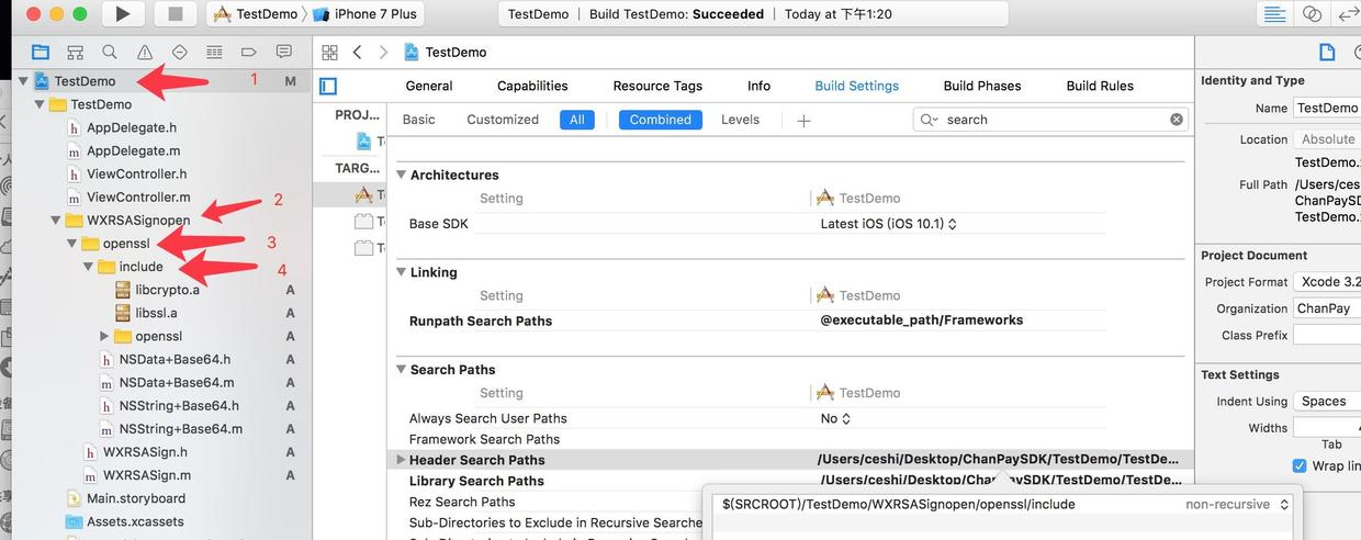 所以路径构成是:$(SRCROOT)/项目名称1(TestDemo)/包含的文件夹2(WXRSASignopen)/包含的文件夹3(openssl)/包含的文件夹4(include)