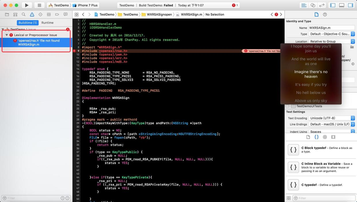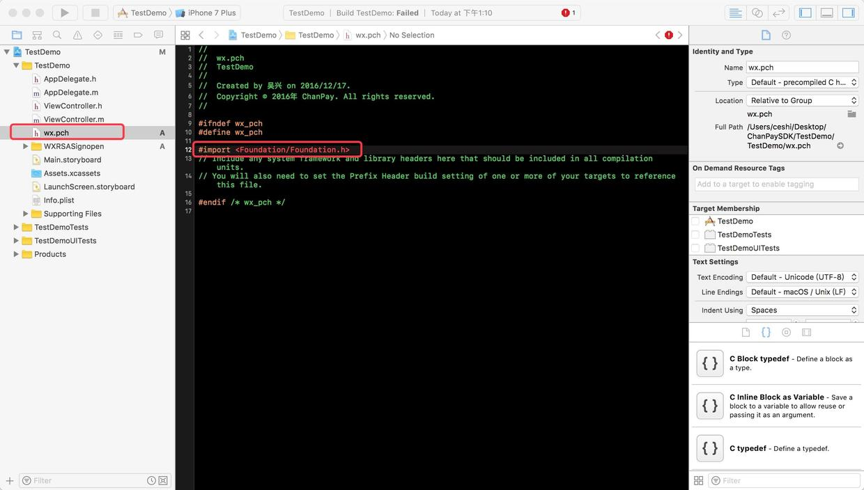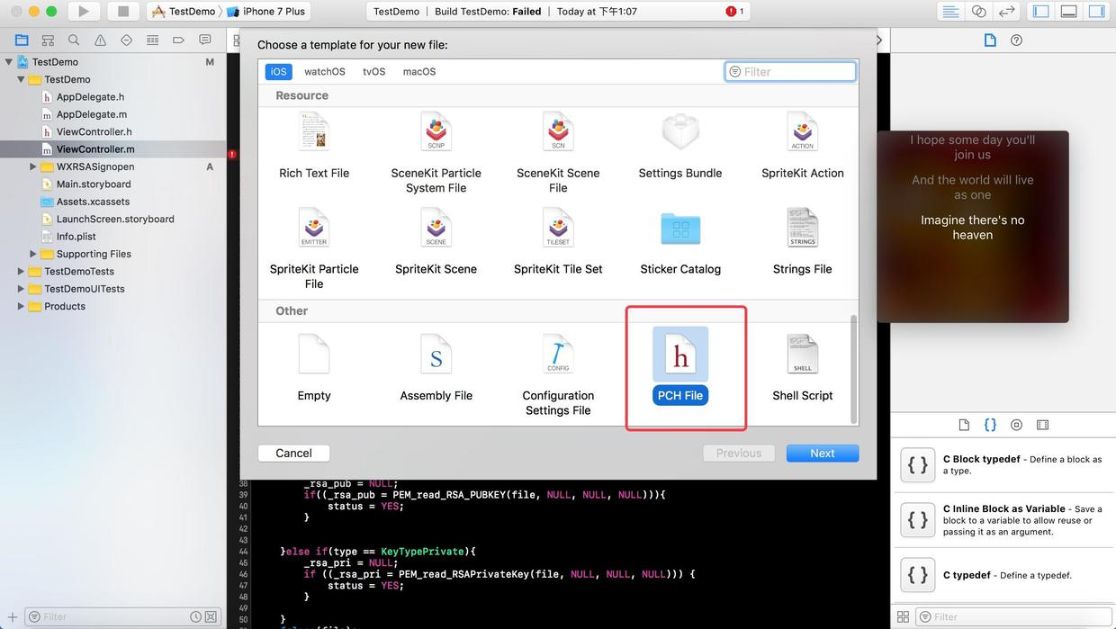如果你使用的是支付宝sdk中的openssl文件和Untils工具类的话,可能其中的rsa.h或其他文件还会报错,这个时候可以打开报错的文件向其中添加#import<Foundation/Foundation.h>即可,如果你嫌一个个添加太麻烦,可以做如下操作创建一个pch文件。
