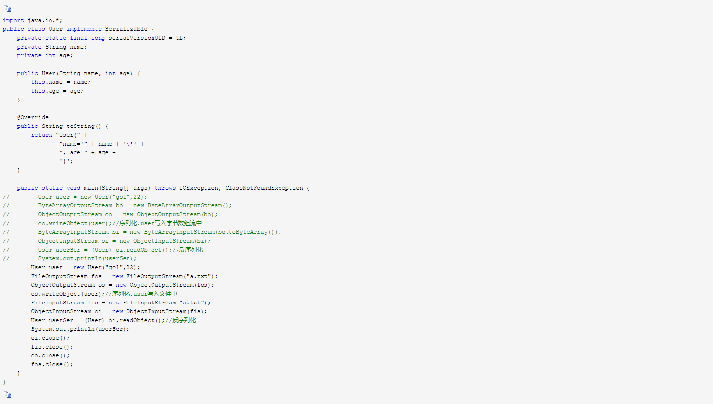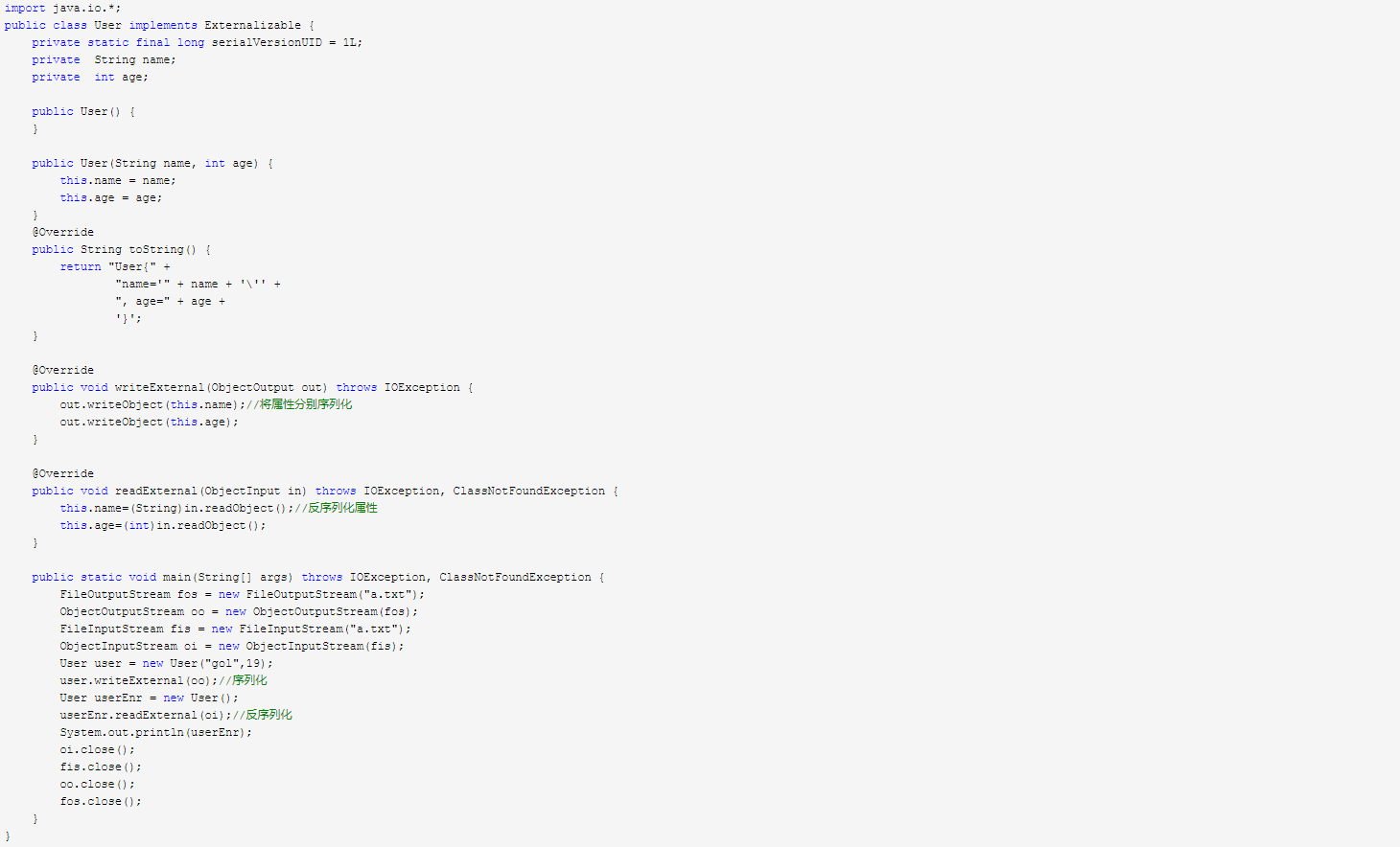 Externalizable接口继承了Serializable接口,替我们封装了两个方法,一个用于序列化,一个用于反序列化。这种方式是将属性序列化,注意这种方式transient修饰词将失去作用,也就是说被transient修饰的属性,只要你在writeExternal方法中序列化了该属性,照样也会得到序列化。