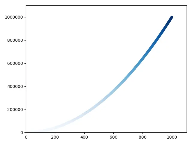 plt.scatter(x_values, y_values, s=40, edgecolors='none', c=y_values, cmap=plt.cm.Blues)