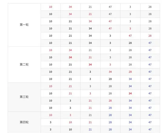 以下表格里,红色表示选中的待排序的数字,粗体表示本轮刚刚排列过的数字,蓝色表示最终排好的数字。