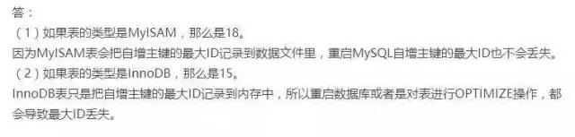 1、一张表,里面有ID自增主键,当insert了17条记录之后,删除了第15,16,17条记录,再把Mysql重启,再insert一条记录,这条记录的ID是18还是15 ?