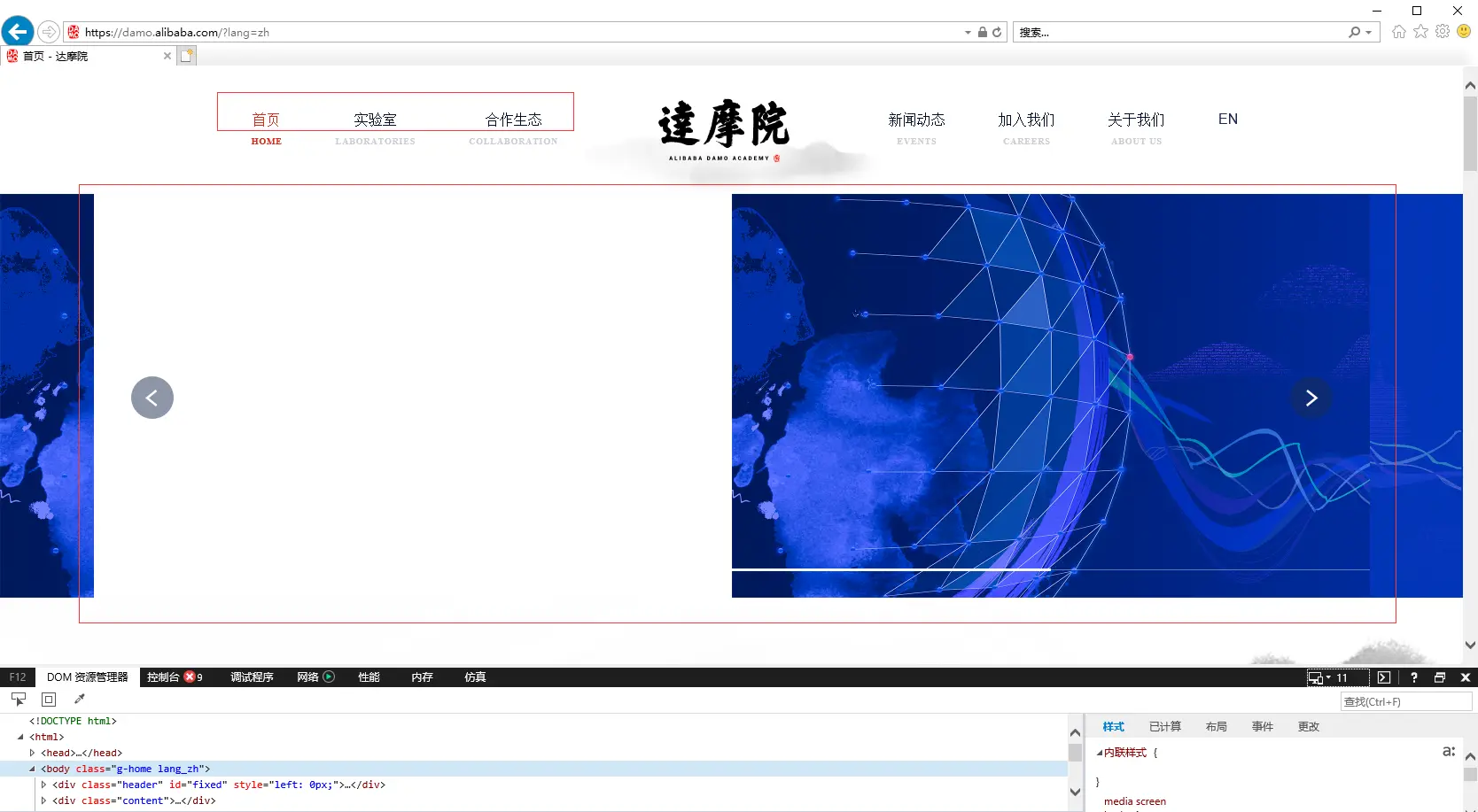 从去年十月份,马云成立阿里巴巴达摩院,到今年9月28号一年整,阿里达摩院官网正式上线。作为从事互联网行业的人,大抵都是会去达摩院官网看看的,本文即我个人从前端角度对达摩院官网,进行的一次简单粗暴的测评,细数圈点之处,并提取一些作为前端可以值得借鉴和思考的代码技巧。第一次写体验报告类文章,想到什么写什么,个人角度或片面,不足之处,或者您有更好的见解,在留言处欢迎交流。当然希望有阿里达摩院的同学看到我这篇简单的测评文章,可以把文中描述的达摩院官网中我个人觉得是bug的地方和优化的地方修复一哈。
