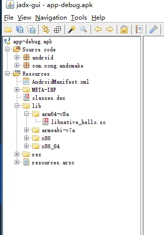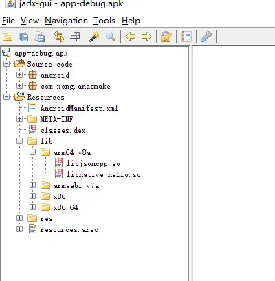 所以啦,native_hello.so依赖于jsoncpp.so,即jsoncpp.so必须存在,那么加这个的意思就是,将jsoncpp.so打入apk中。我们可以将上面的集成so动态库的apk用 jadx 查看一下,如下: