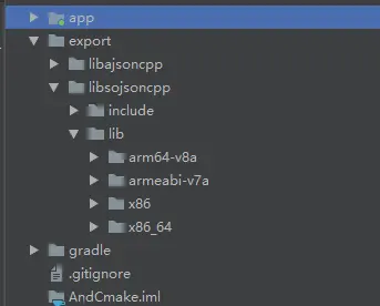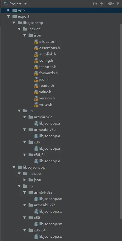 都放在了Project/export文件夹中,且在里面将so和a分开,分别放在了,libajsoncpp和libsojsoncpp文件夹中,在每个文件夹中,又有include文件夹来放库所需要的头文件,lib中放so以及a库文件。