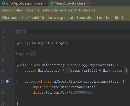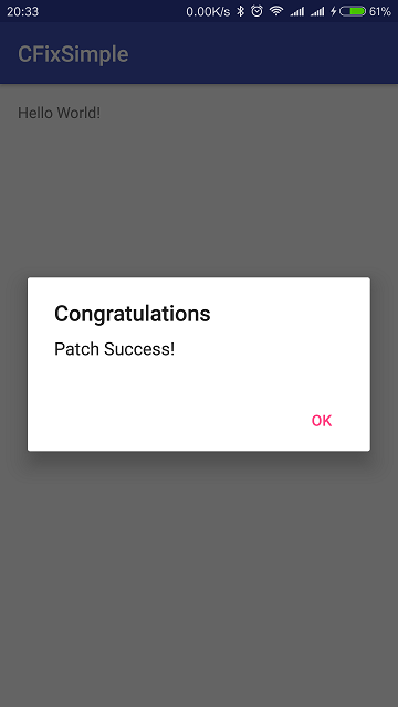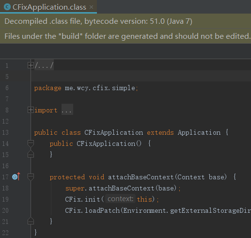 compile 'me.wcy:cfix:1.0'}在 Application 中插入 Hack dex 和 patch