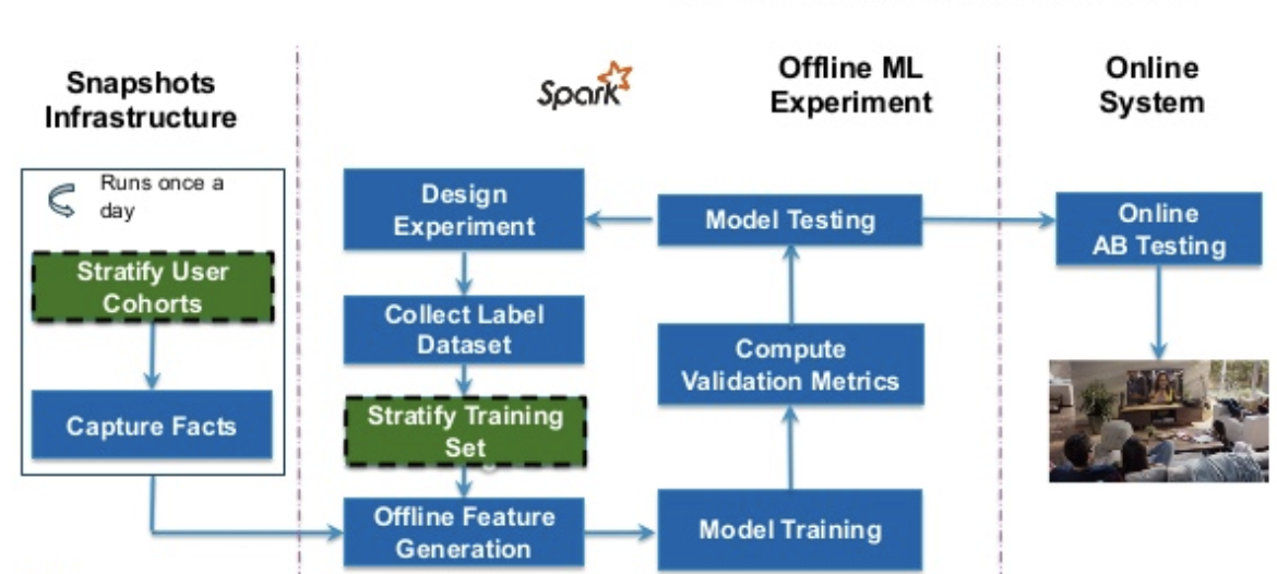 第一次talk记录了我们为个性化模型构建训练数据基础架构的过程 - 我们如何构建一个fact store,用于在不断变化的新需求环境中提取feature。 为了提高我们的个性化推荐的质量,我们使用历史数据离线尝试不同的算法idea。 然后,改进我们的离线指标的idea进入A / B测试,这些测试通过核心指标(例如用户参与度,满意度和用户留存率)的统计显著改进来衡量新算法的好坏。 此类离线分析的核心是history facts(例如,查看成员的历史记录,“我的列表”中的视频等),这些事件用于生成机器学习模型所需的feature。 我们需要确保我们捕获足够的fact数据以涵盖各种实验的所有分层需求,并保证我们所收集的数据在时间上准确。