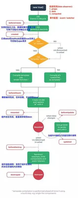 生命周期:Vue 实例从开始创建、初始化数据、编译模板、挂载Dom→渲染、更新→渲染、卸载等一系列过程,我们称这是 Vue 的生命周期,各个阶段有相对应的事件钩子