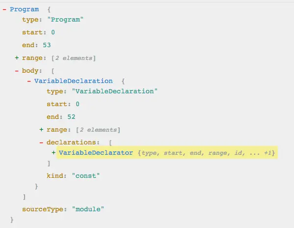 由于全展开太长了哈,感兴趣的自行尝试,会发现层级嵌套的特别深,找到 bar 的属性需要 Program.body[0].declarations[0].init.properties
