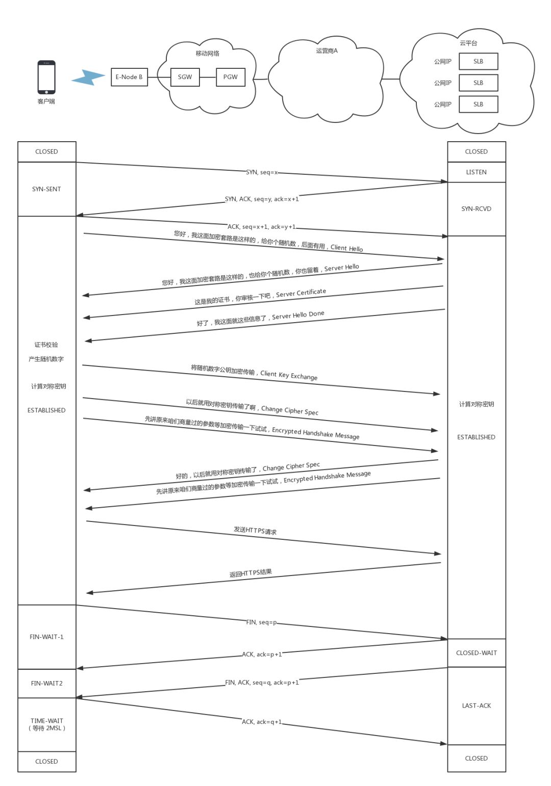 HTTPS协议是基于TCP协议的,因而要先建立TCP的连接。在这个例子中,TCP的连接是从手机上的App和负载均衡器SLB之间的。