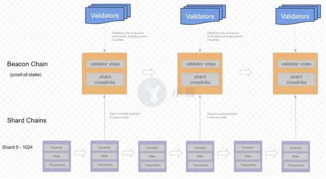 分片链(Shard Chains)负责处理交易并存储帐户数据,每个分片链(目前设置为1024个)都跟主链相连接;每个分片链是一个独立的POS链,它们各自有自己的状态(如账户余额、智能合约等)和交易历史,同时和信标链同使用POS共识机制。每隔一段时间(约1小时),系统会随机给各验证节点分配一个分片,负责验证和确认该分片上的区块。“交连(cross link)”将用于确认各分片链中的哪些区块进入信标链,同时交连也是各分片链之间互操作的主要方式。