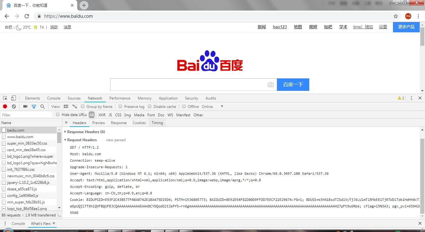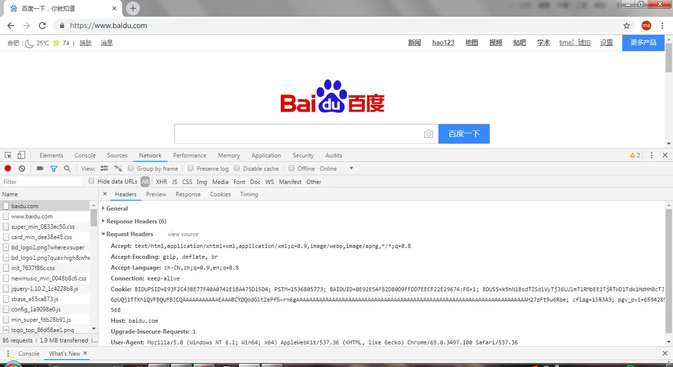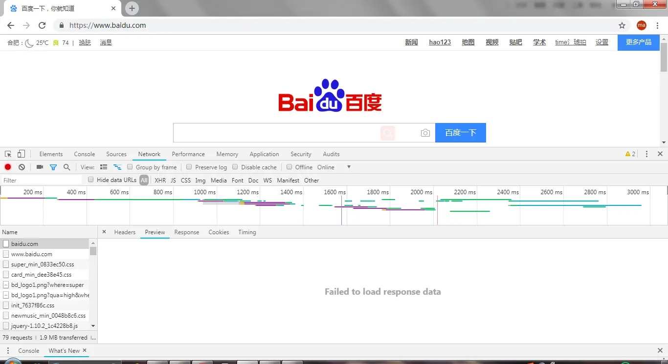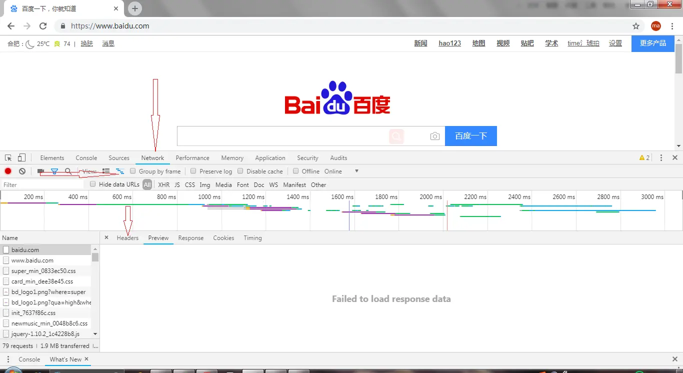 打开Chrome浏览器后按F12,在网址栏中输入www.baidu.com,再回车,如图