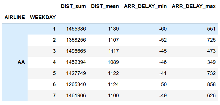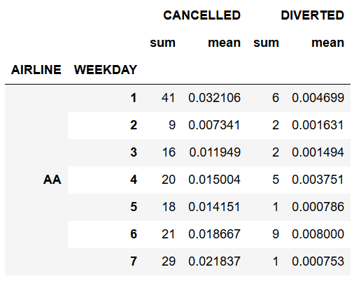 In[10]: flights.groupby(['AIRLINE', 'WEEKDAY'])['CANCELLED'].agg('sum').head(7)
