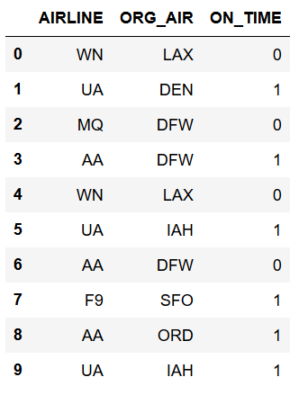 flights[['AIRLINE', 'ORG_AIR', 'ON_TIME']].head(10)