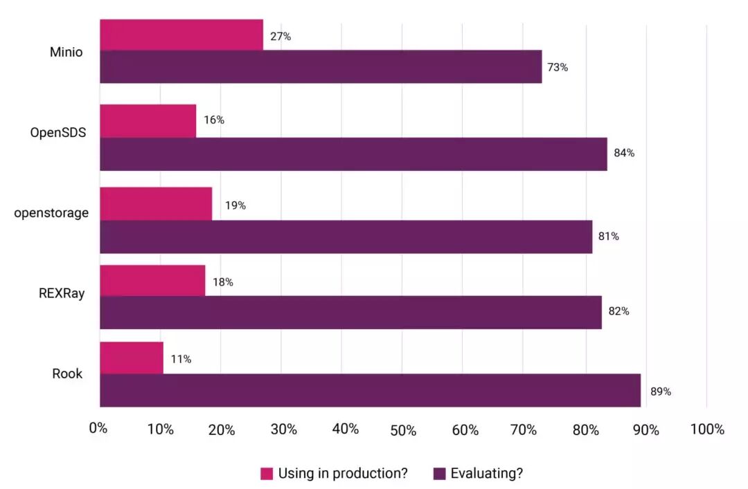 Minio:生产环境应用的受访者占比27%,正在评估中的受访者占比73%(上期调查28%)。