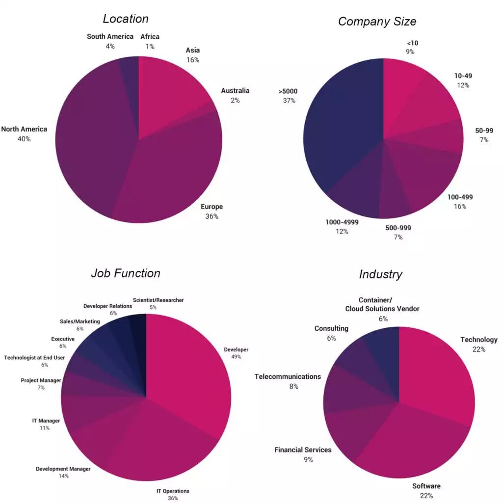 这是迄今为止收到过最多的调查回复,共有2400人有效参与了调查,受访者主要来自北美(40%)和欧洲(36%)。均为研发人员或IT相关的角色,分布情况如下:
