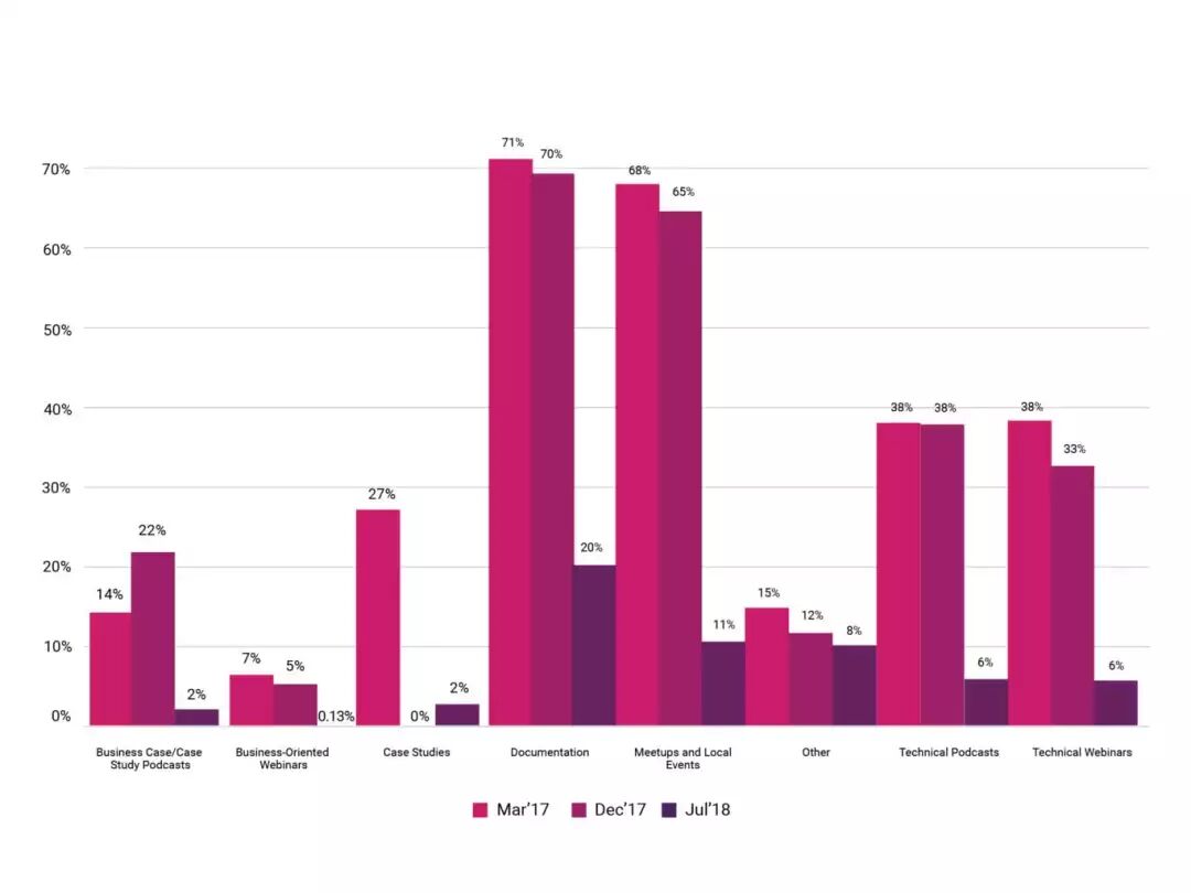 对于刚刚涉足云原生项目并期望学习更多相关知识的初学者,以下是受访者学习云原生技术的首要几种方式: 文档 20%的受访者使用文档来学习云原生项目,这也是本次调查引用的首要资源。例如,SIG-Docs帮助维护的大量Kubernetes详细文档。这其中包括了从如何开始使用某个特定功能到以贡献者身份参与项目的最佳方式等等的所有内容。每个CNCF项目在其网站上都有大量的文档,可以点击https://www.cncf.io/projects/获取。 KubeCon + CloudNativeCon 12%的受访者选择参加KubeCon + CloudNativeCon,以了解更多他们正在使用的技术。KubeCon + CloudNativeCon集中了所有CNCF项目,并将来自开源云原生社区的技术大咖聚集一堂,以进一步推动原生云计算的发展。这项活动每年在欧洲、中国和北美各举行一次。 CNCF网站和在线研讨会 12%的受访者会访问CNCF网站和参加在线研讨会。CNCF.io是所有云原生项目的一个主要来源,提供包括近期活动、培训、认证、博客等等诸多主题的信息。 CNCF在线研讨会每周二上午10点到11点(PT)举行。您可以查看近期日程[1],并查看往期在线研讨会[2]的录音和幻灯片。 聚会和当地活动 有11%的受访者会通过参加聚会和当地活动来了解云原生技术。CNCF在我们会员体系下主办了149个聚会,活动遍布33个国家,涉及会员超过76000人。你可以点击这里[3]查看的你所在地的聚会。 您可以点击这里[4]查看近期CNCF和世界各地云原生社区的活动,包括从会议到路演等等。 推特 10%的受访者通过Twitter获取信息。通过Twitter账号,CNCF发布项目、社区和基金会的新闻。读者可以关注自己所喜欢的云原生项目,点击这里[5]可以找到这些Twitter列表(和相关的社交账户)。 学习云原生技术的途径: