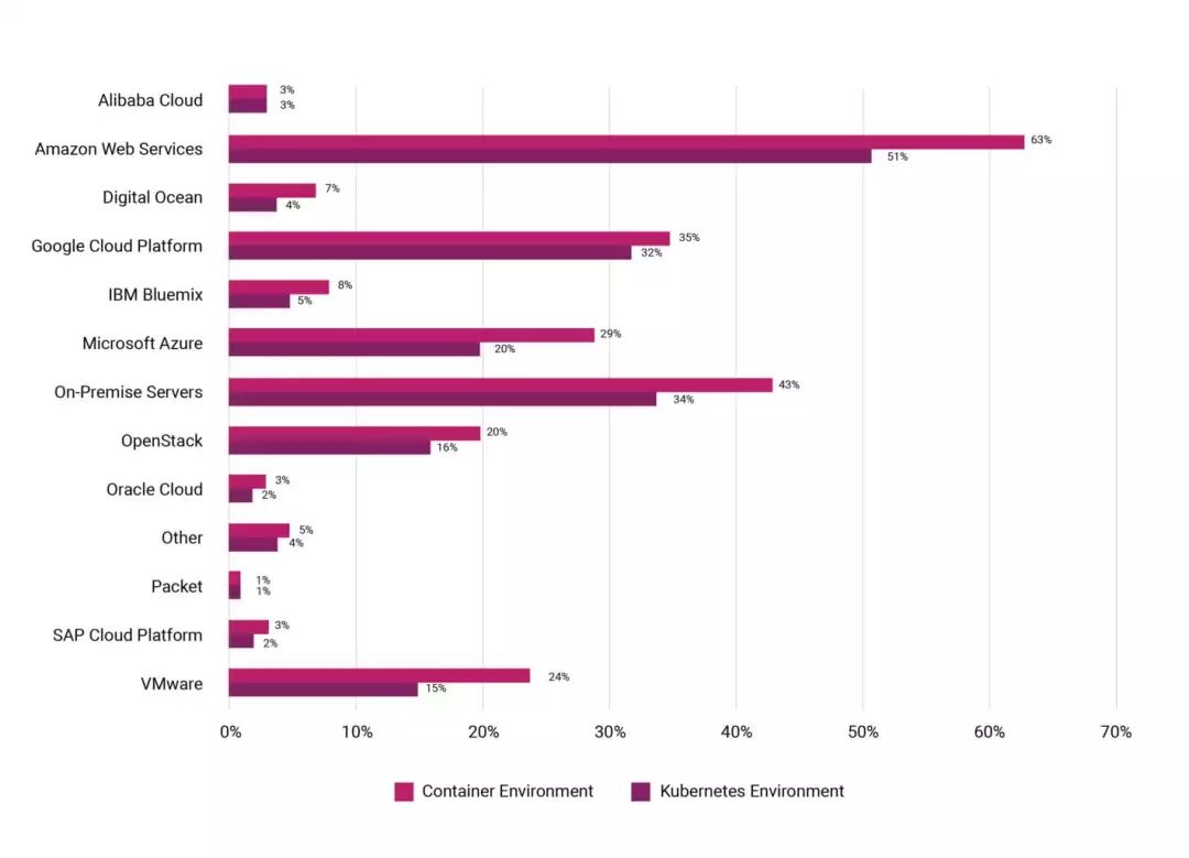 58%的受访者在生产环境中采用了Kubernetes。同时,42%的受访者正在为以后应用进行评估。而在人员规模5000以上的企业中,有40%的受访者在生产环境中使用了Kubernetes。 在生产环境中,40%的受访者运行了2-5个Kubernetes集群,运行1个集群的有22%,6-10个集群的有14%,运行集群数超过50个的受访者公司为13%(2017.12数据为9%)。 在Kubernetes所运行的平台环境方面,51%的受访者运行在AWS(上期数据为57%),企业自有数据中心服务器有37%(上期数据为51%),谷歌云平台从上期的39%下降到了32%,微软Azure从23%降至20%,OpenStack从22%降至16%,然而,运行在VMware平台上的却从1%大幅升至15%。以下图标展现了受访者的Kubernetes所部署的平台和容器所部署平台的对比。 Kubernetes环境 vs 容器环境: