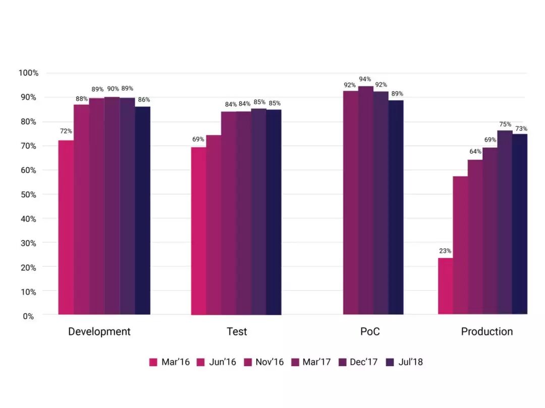 73%的受访者在生产环境采用容器化服务,剩余的27%表示计划在以后采用这项技术。这个数据在17年12月的调查分别是75%和25%。当前在POC环境采用容器化的受访者有89%,而用于测试环境和开发环境的分别是85%和86%。 容器所用于的环境类型: