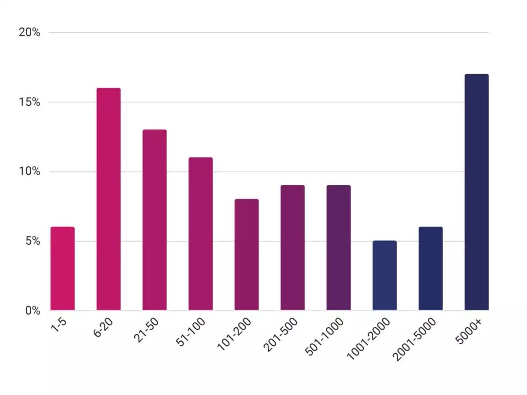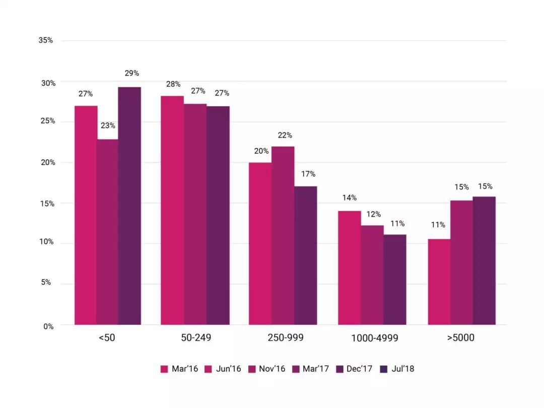在本次最新版的调查问卷中,我们额外添加了发布方面的问题,以便更深入地了解公司如何管理他们的软件开发周期。微服务架构的好处之一是灵活部署的能力,从而允许公司根据需要尽可能频繁的进行应用发布。在微服务之前,典型的发布管理中,应用发布频率要低得多,通常是一年一两次左右。本次调查中,这一点变化突出,除发布频率外,受访者发布周期的各种发布占比相当均匀: