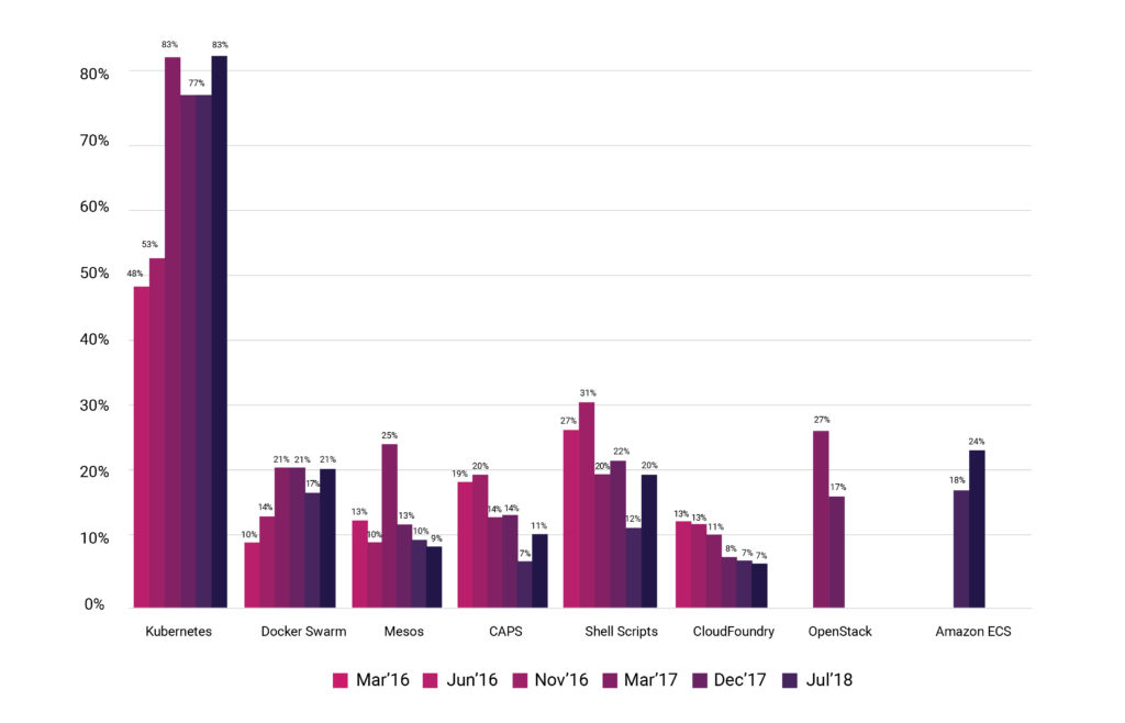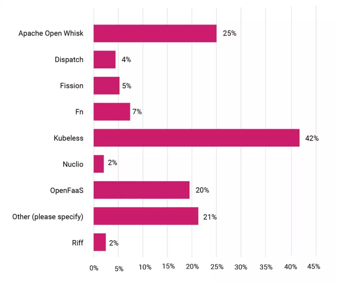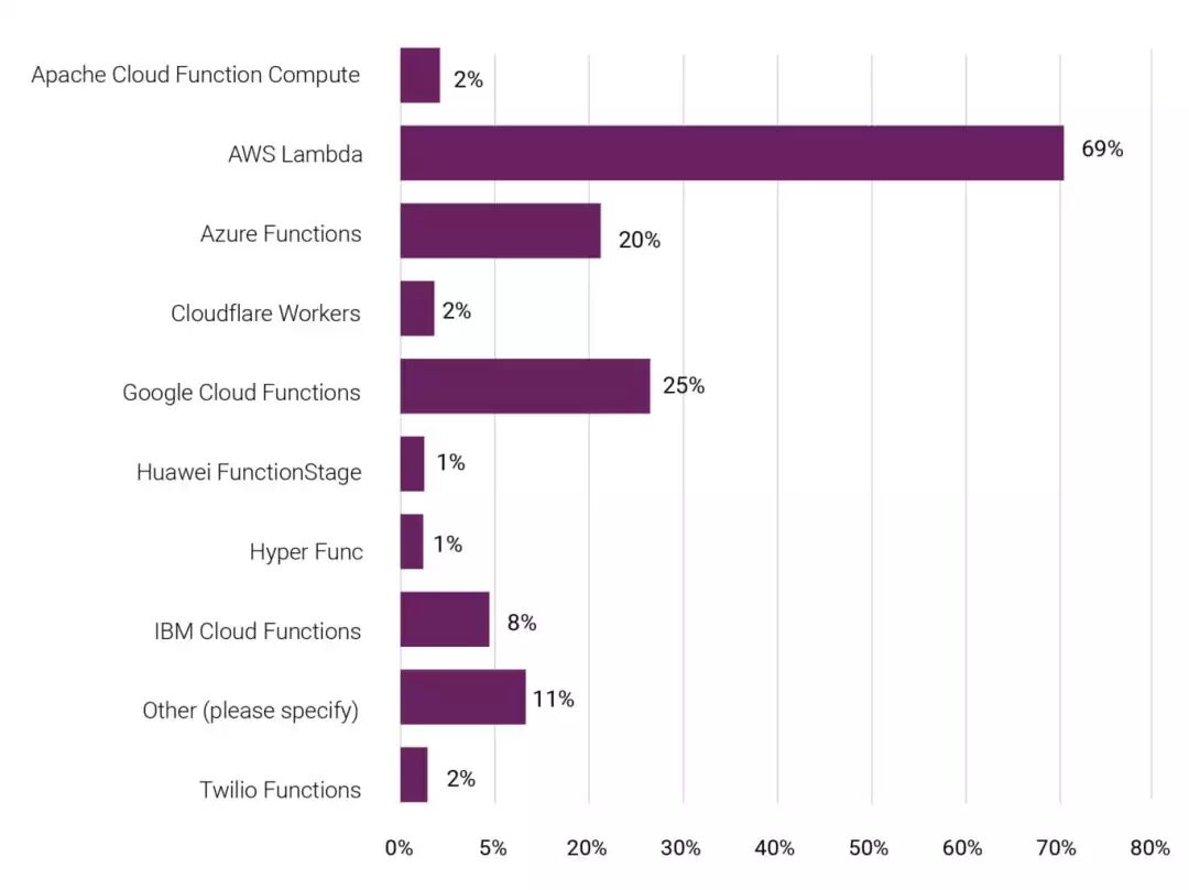 自2017年12月以来,受访者中的大部分都使用了类似AWS Lambda(70%) 的平台服务。这使得无服务器技术的应用不断增长,增幅达到22%。