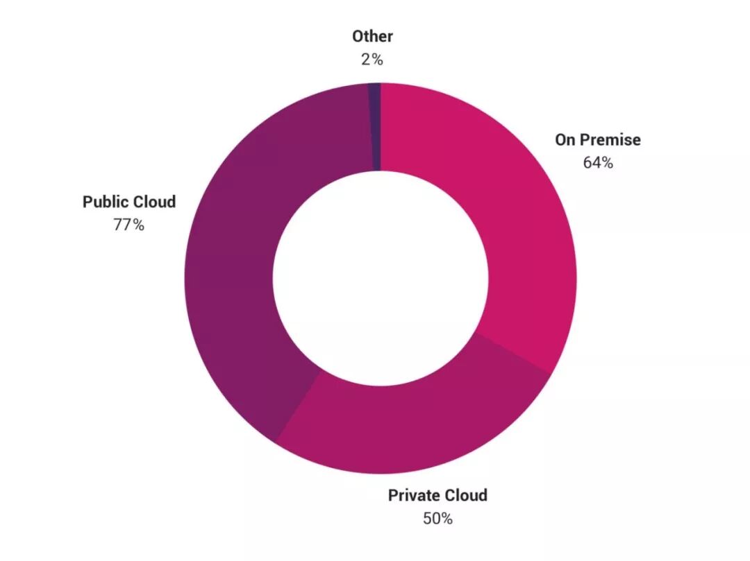 企业用云的数据分布情况是:自建数据中心占比64%,私有云占比50%,还有77%的企业采用了公有云的方案。 所采用的数据中心类型:
