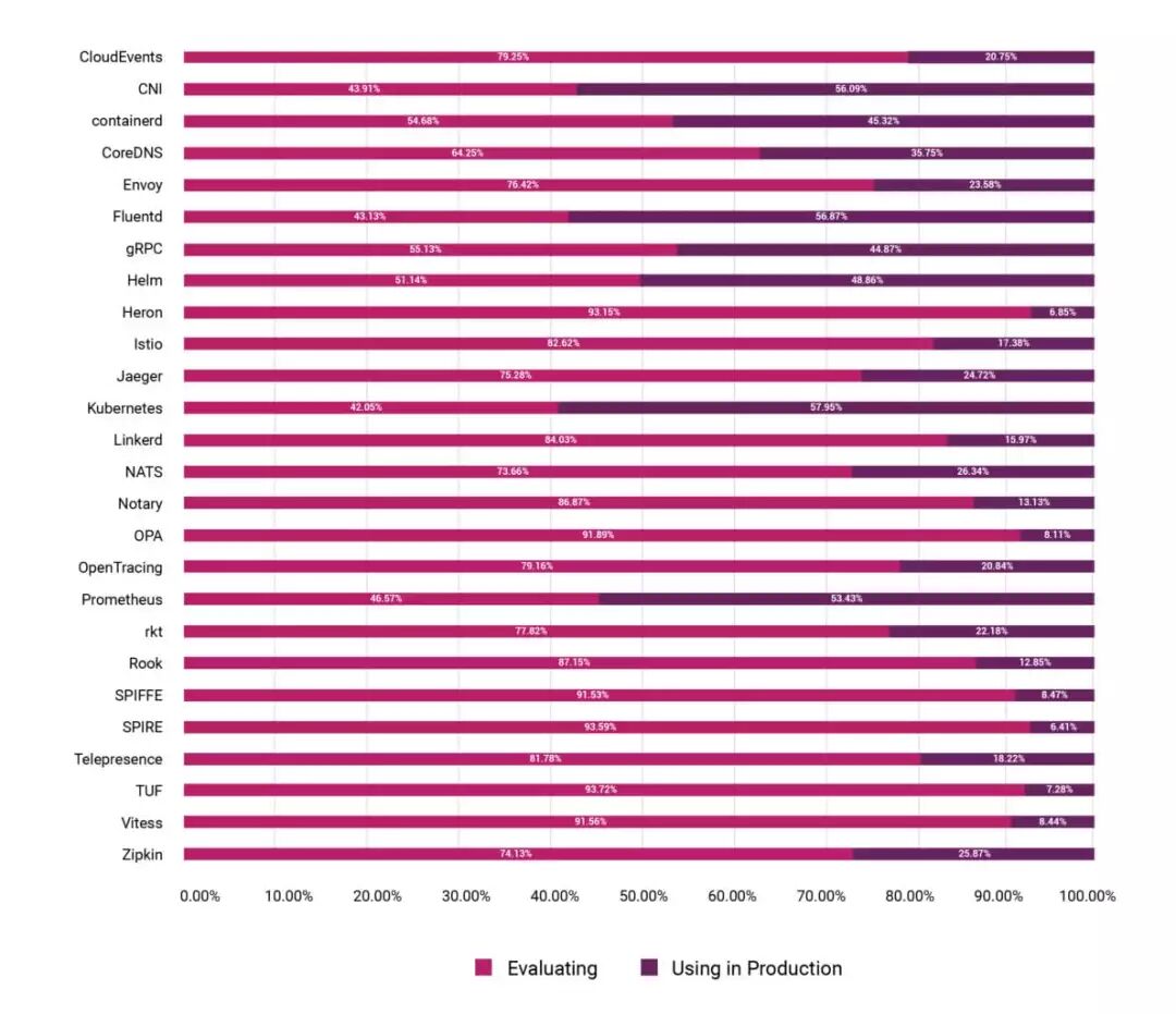 自2017年12月以来,CNCF项目在生产环境应用平均增长超过200%,所评估的项目数甚至达到了372%的增长。
