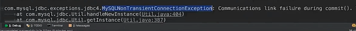 - 使用debug方式模拟运行,第一个order事务提交以后,第二user个事务执行的时候把mysql服务给停掉,出现如下异常