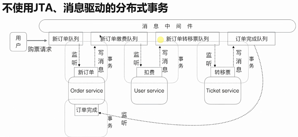 再比如User service 扣费成功后,往新订单转移票队列写消息,这时Ticket service 正在处理中或者处理中发生了失败,这中间的过程中用户查看自己的余额已经扣费成功,但票的信息却没有,此时可以使用事务失败回滚的方式依次回退,这种叫弱一致性;又或者可以把处理失败的内容发送至一个错误队列中,由人工处理等方式解决,这种叫最终一致性。