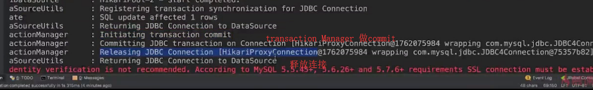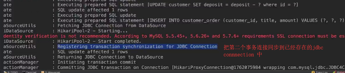 特别说明: @Transactional 如果没有做任何配置的情况下,则会使用DBConfiguration类中@Primart注解下的DataSource,用它去做datasource connection