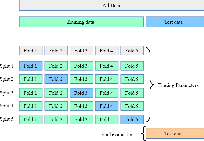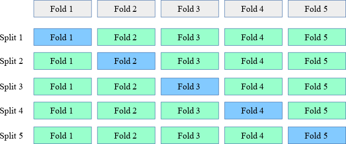 进行交叉验证的最常用方法是k折交叉验证,其中数据首先被分成k(通常是 5 或 10)个相等大小的折叠,然后对于每次迭代,使用k折中的一个作为测试数据,其余作为训练数据: