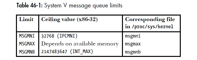 structmsqid_ds {structipc_permmsg_perm;/* Ownership and permissions */time_t msg_stime; /* Time of last msgsnd() */time_t msg_rtime; /* Time of last msgrcv() */time_t msg_ctime; /* Time of last change */unsignedlong __msg_cbytes; /* Number of bytes in queue */msgqnum_t msg_qnum; /* Number of messages in queue */msglen_t msg_qbytes; /* Maximum bytes in queue */pid_t msg_lspid; /* PID of last msgsnd() */pid_t msg_lrpid; /* PID of last msgrcv() */