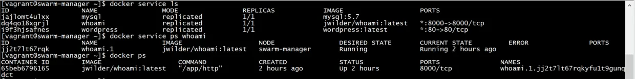 docker service create --name whoami -p 8000:8000 --network demo jwilder/whoami