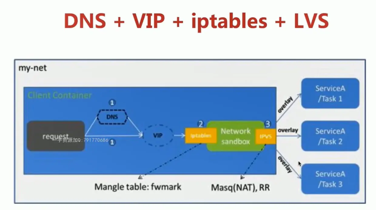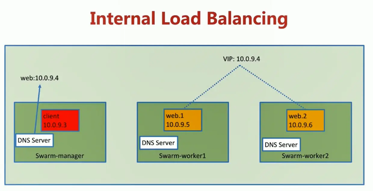 当在docker swarm集群模式下创建一个服务时,会自动在服务所属的网络上给服务额外的分配一个虚拟IP,当解析服务名字时就会返回这个虚拟IP。对虚拟IP的请求会通过overlay网络自动的负载到这个服务所有的健康任务上。这个方式也避免了客户端的负载均衡,因为只有单独的一个虚拟IP会返回到客户端,docker会处理虚拟IP到具体任务的路由,并把请求平均的分配给所有的健康任务。