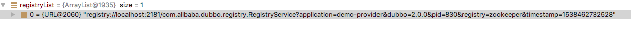 此时,registryUrl=zookeeper://localhost:2181/com.alibaba.dubbo.registry.RegistryService?application=demo-provider&dubbo=2.0.0&export=dubbo%3A%2F%2F192.168.31.132%3A20880%2Fcom.alibaba.dubbo.demo.DemoService%3Fanyhost%3Dtrue%26application%3Ddemo-provider%26dubbo%3D2.0.0%26generic%3Dfalse%26interface%3Dcom.alibaba.dubbo.demo.DemoService%26methods%3DsayHello%26pid%3D1122%26side%3Dprovider%26timestamp%3D1538487268569&pid=1122×tamp=1538487268461