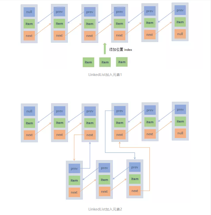 在构造方法中调用addAll方法,相当于是向一个空链表中添加集合c中的元素。 如果是在已有元素的链表中调用addAll方法来添加元素的话,就需要判断指定的添加位置index是否越界,如果越界会抛出异常;如果没有越界,根据添加的位置index,断开链表中index位置的节点前后的引用,加入新元素,重新连上断开位置的前后节点的引用。过程如下图:(此处用了xiaoyanger的图)