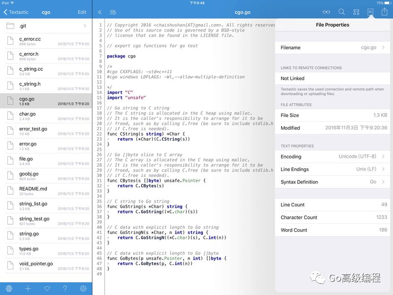 如果Go语言代码是放在Git服务器中,可以通过Working Copy应用将仓库克隆到iOS中,然后再Textastic中通过iOS协议打开工作区文件。编辑完成之后,在通过Working Copy将修改提交到中心仓库中。