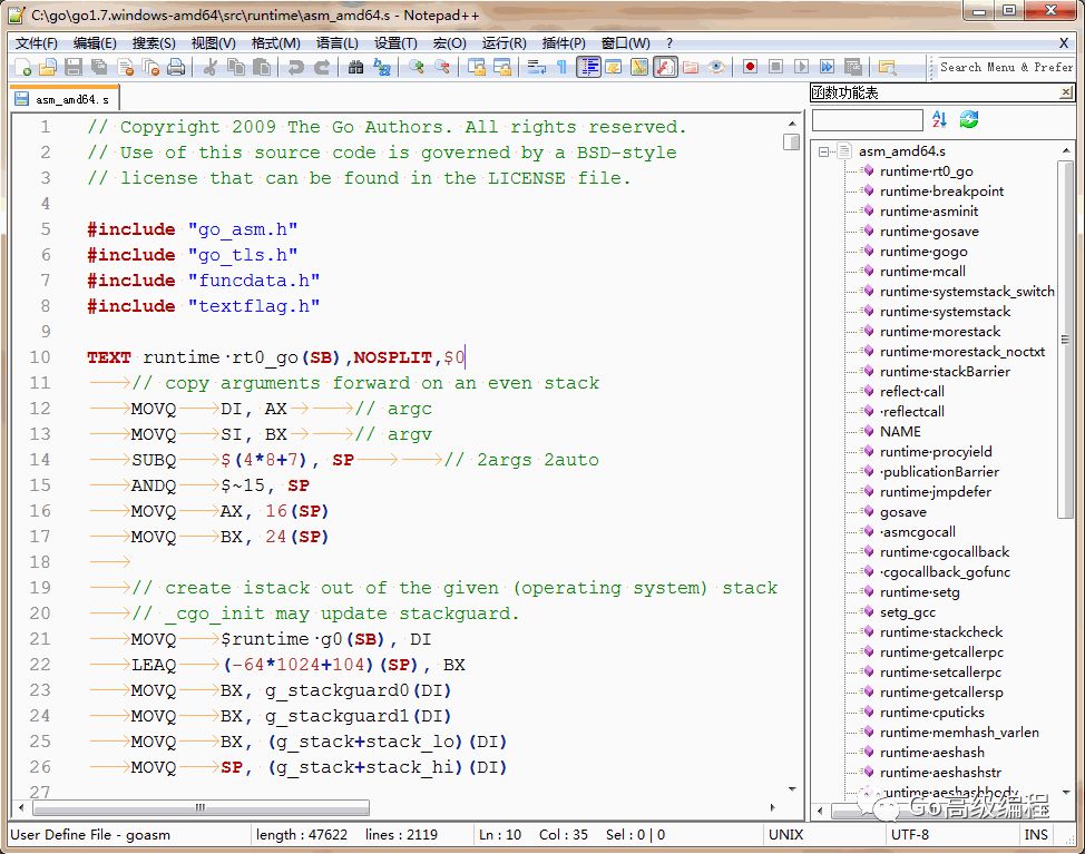 下面是Go语言汇编的语法高亮预览:其中右侧是汇编函数列表: