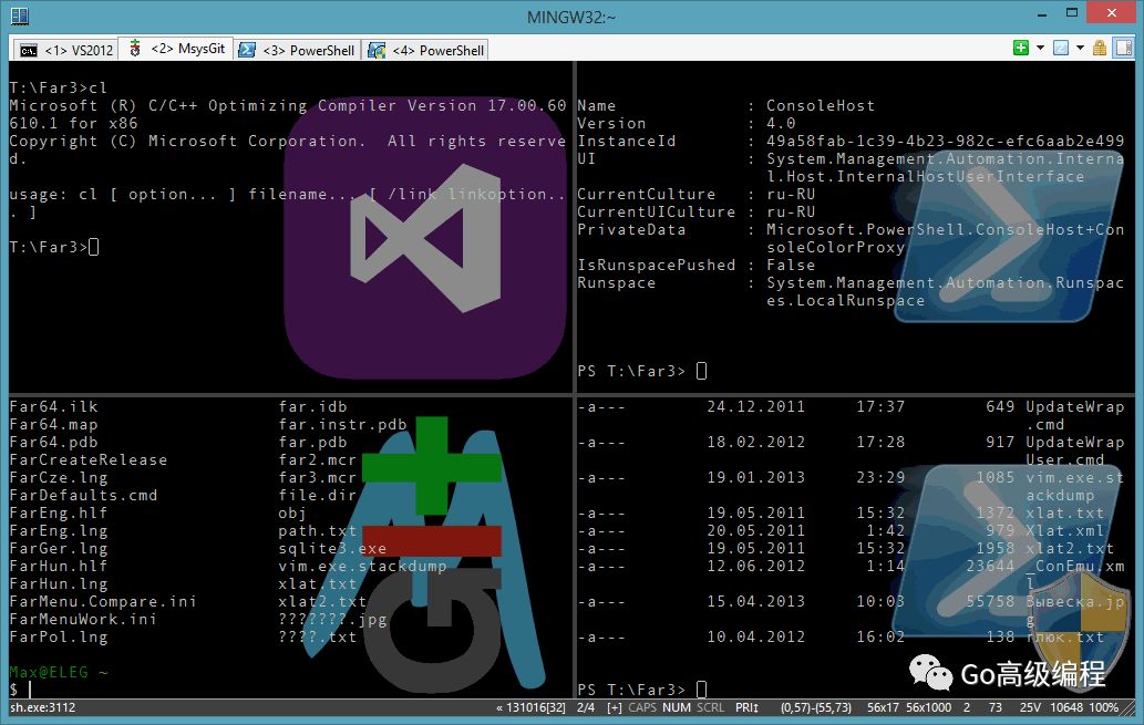 不过Windows自带的命令行工具比较简陋,不是理想的命令行开发环境。如果读者还没有自己合适命令行环境,可以试试ConEmu这个免费命令行软件。ConEmu支持多标签页窗口,复制粘贴也比较方便。下面是ConEmu的预览图: